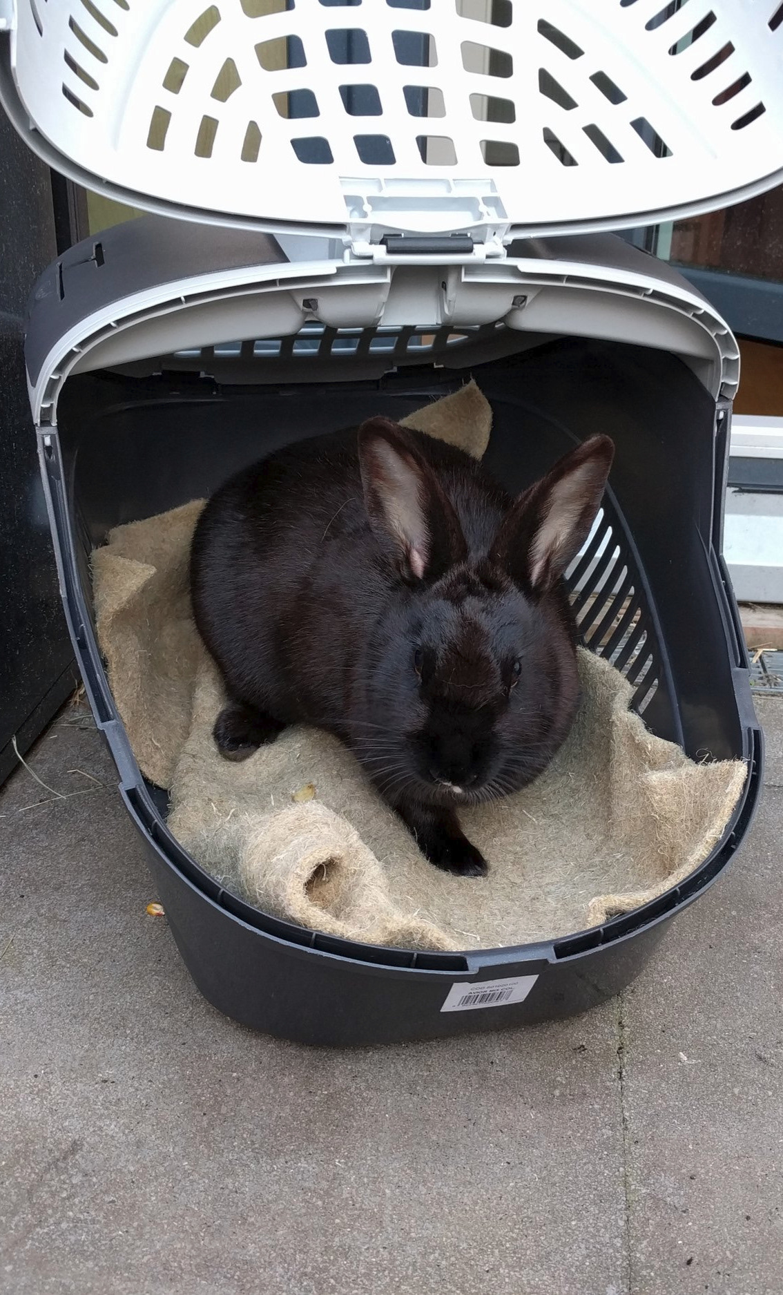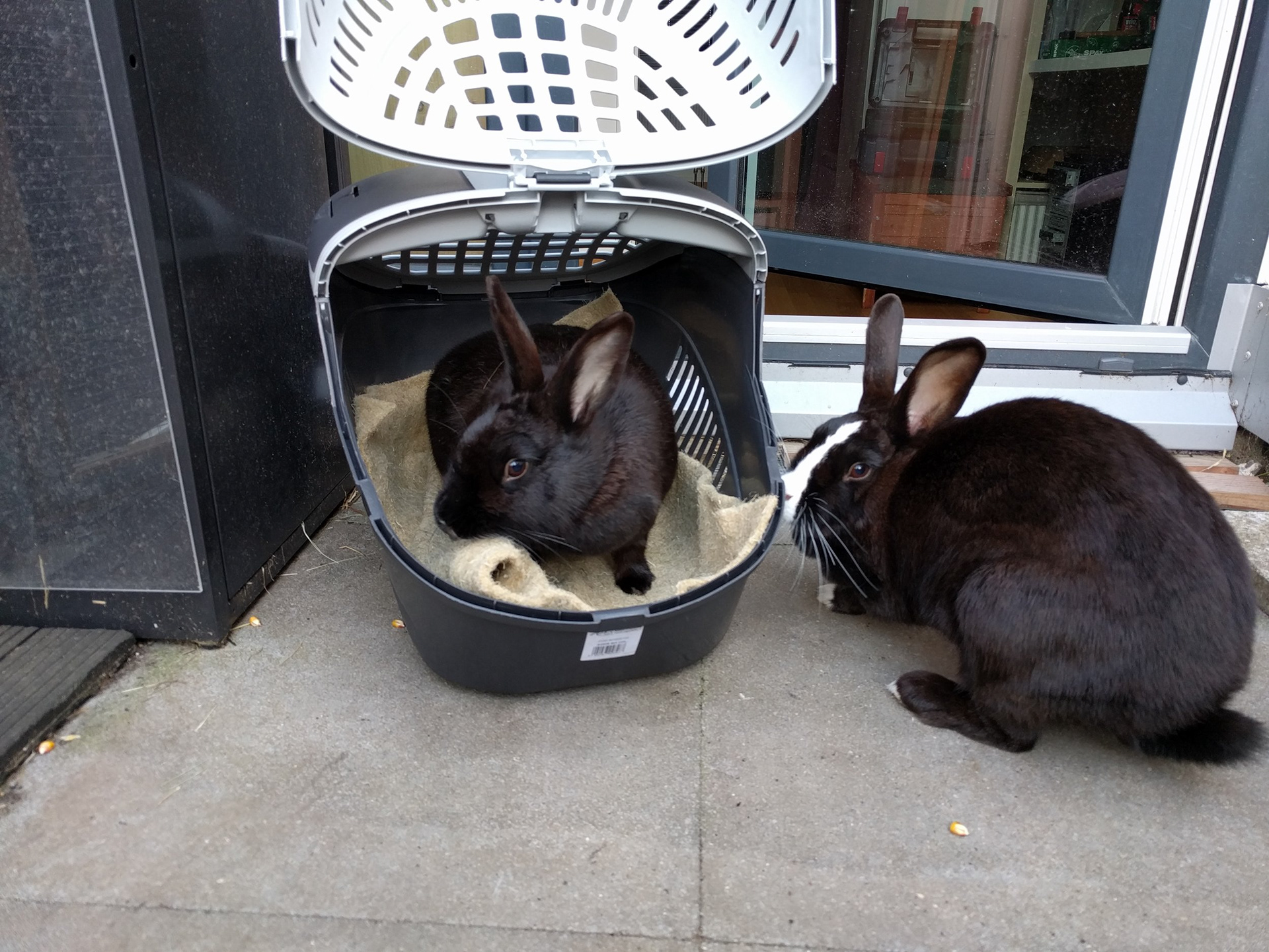 Keine Sorge - sie hat später auch noch etwas abbekommen. Aber erst als ich den Großteil schon weggefuttert hatte... Dann hat sie sich nämlich doch in die Box getraut. Und siehe da - es ist nichts passiert! Alles vollkommen harmlos. Was Pucci nur immer hat ... Ich frage mich nur was die Zweibeiner mit Urlaub und Hasenpension meinen. Naja, wird schon nichts Wichtiges sein - Hauptsache die Banane schmeckt!