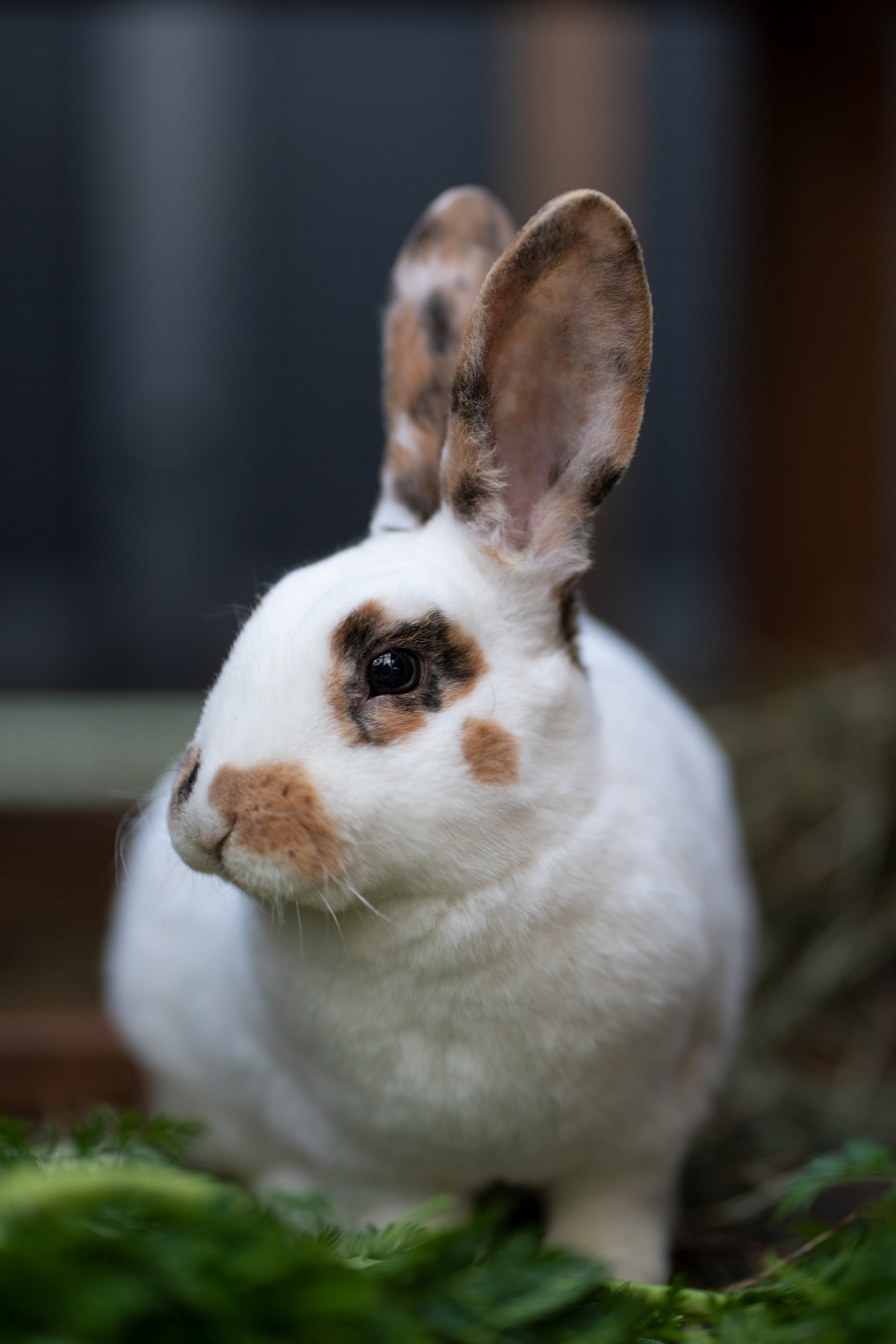 Erkennungsmerkmal: dreifarbige Ohren, brauner Bart, vorwiegend weiß mit Tupfen